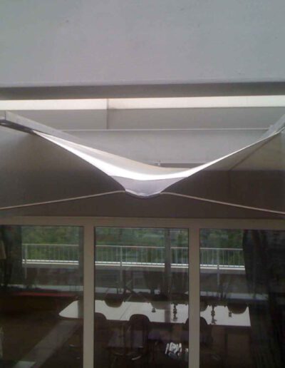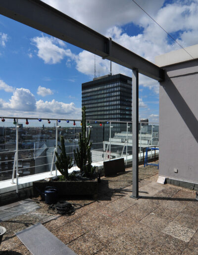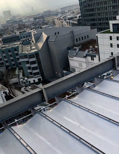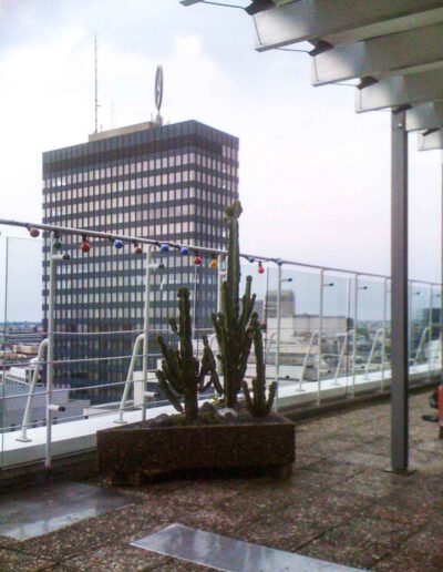 Das Membranedach welches 2010 von mir geplant (Bauantrag extern), gefertigt und eingebaut wurde hat in der letzten 12 Jahre allen Stürmen getrotzt. Auch Frost und Sonne die 45 m über dem Breitscheidplatz stärker einwirken als andernorts konnten dem Dach bis auf einige undichte Stelle nichts anhaben. Dafür dass es einst nur als Verschattung geplant war, hat es erstaunlich guite Dienste geleistet. Die aktuellen Abdichtungsarbeiten werden im kommenden Frühjahr abgeschlossen.