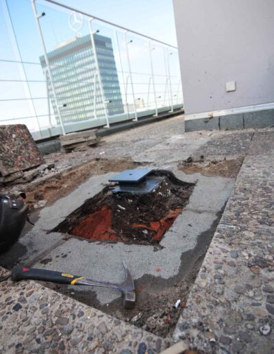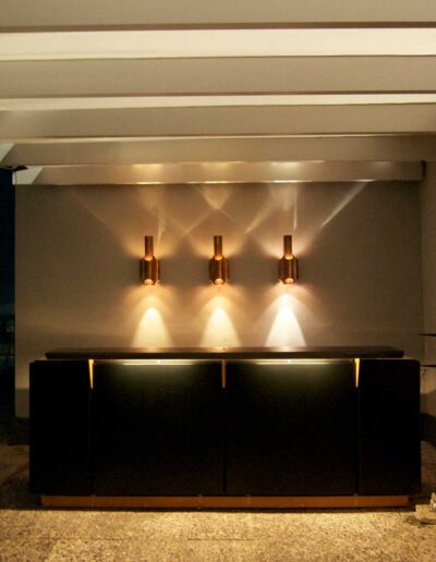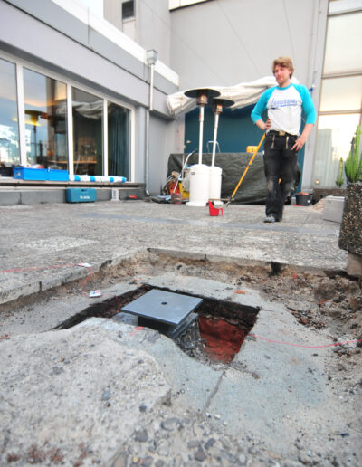 In Zusammenarbeit eines Fachbetrieb wurde die Elektroinstallation neu geplant und ausführende Arbeiten überwacht. Dazu wurden ca. 10 Endgeräte und weitere 10 Steckdosen über die gesamte Terrasse verteilt mit Strom versorgt. So können für den gastronomischen Betrieb flexibel auch temporäre Stromabnehmer ohne provisorische Kabel mit Strom versorgt werden. Dazu wurden alle Kabel unter das Pflaster, oder hinter Verkleidungen oder unter Putz geführt. So sind keine Kabel mehr sichtbar.