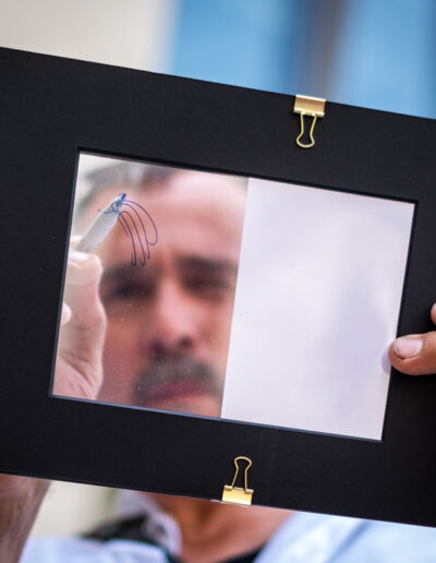 Von 2D-Netzhaut über 3D-Interpretation im Gehirn zurück zu 2D aufs Papier. Im Rahmen einer Weiterbildungsmaßnahme des Kölner Architekturbüros JSWD Architekten (Thyssen Krupp Campus) nahm ich als einer von vier Dozenten an einem Zeichen- & Aquarellworkshop teil. Entsprechend meines Konzeptes: „Beim Sehen das Denken abgewöhnen!“ vermittelte ich meinen Ansatz, das Zeichnen zu lernen. Dabei lernten die Teilnehmern, mit Hilfsmitteln wie Passepartout, aufgespannte Rahmen, etc. die Zwischenräume als zweidimensionale Flächen wahrzunehmen sowie zum Beispiel mit Sonnenbrille oder zugekniffenen Augen die Sicht einzuschränken, den Blick unscharf zu stellen. Wir übten, den Raum als vereinfachte Fläche wahrzunehmen. Der Effekt dabei ist, dass Perspektiven, Proportionen, Licht und Schatten meist präziser erfasst und dargestellt werden, als bei einer konstruierten Perspektive beispielsweise bei Gebäuden.
