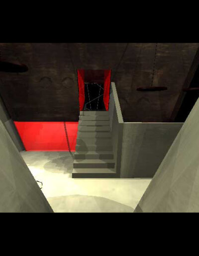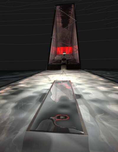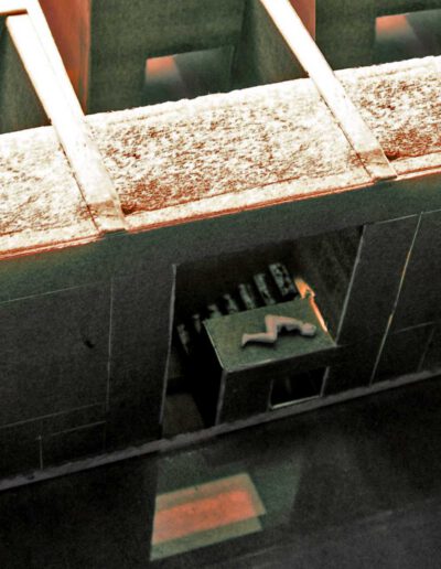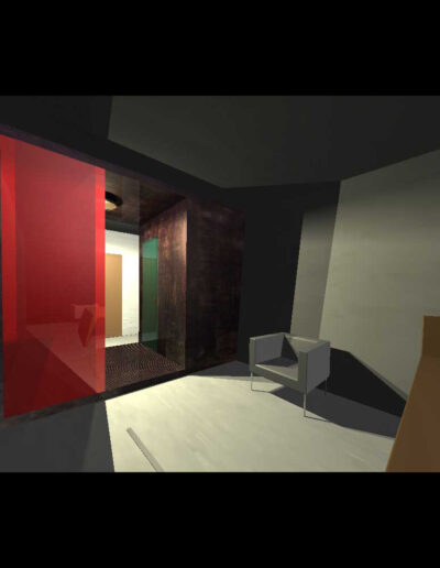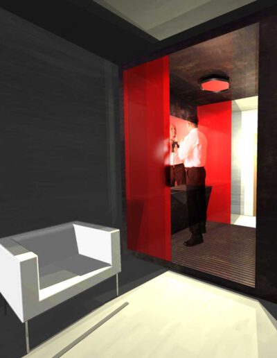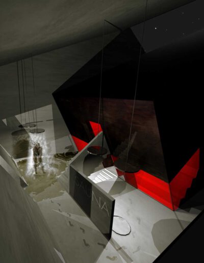 2. Alle höher temperierten Trocken- und Nassbereiche im Badehaus und Hotel sind mit roten Glasflächen umkleidet. Das rote Glas erinnert an glühende Lava oder Feuer.