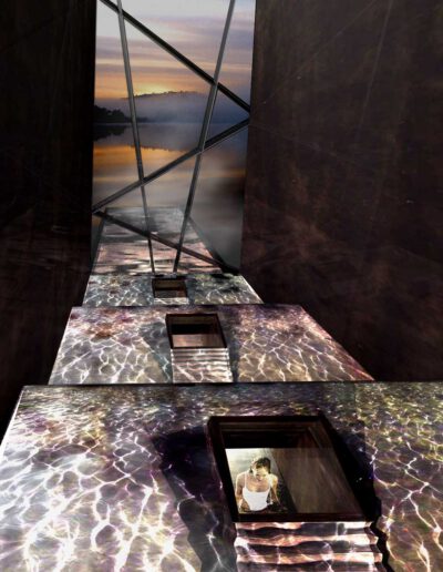 2. Der unterirdische Wasserzulauf, welcher das Maar speist, sowie die generell über Gesteinsschichten verlaufenden Wasservor- kommnisse werden durch die stufenweise Schichtung der Schwimmbecken und einen von innen nach außen abfallenden Temperatur- verlauf….38 Grad….36 Grad…32 Grad….26 Grad….14….Grad…erlebbar.