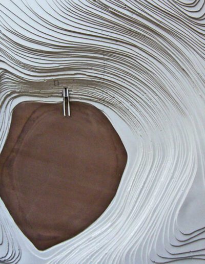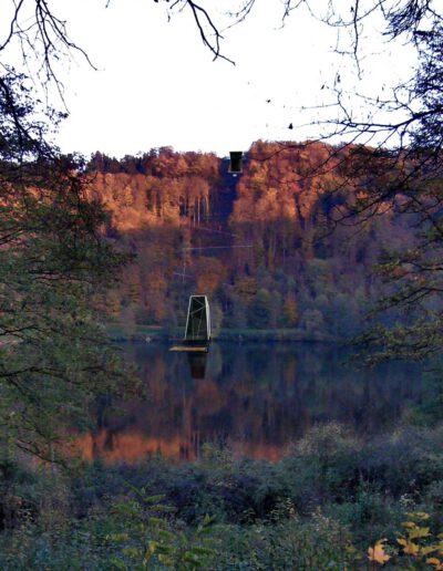 Hotel und Bad werden auf der Achse der vorhanden Baumschneise auf die Mitte des Maares und gegen westliches Abendlicht ausgerichtet. Das Bad wird in unmittelbarer Nähe auf der Höhe des Wasserspiegels positioniert und findet Schutz in der bergenden Kessellage des Maares. Das Hotel findet seinen Platz in oberer Hanglage, von der aus ein weitreichender Blick in die Landschaft geboten wird. Die Baukörper wirken wie Medaillons oder Schmuckstücke auf der ausgebreiteten Landschaft.