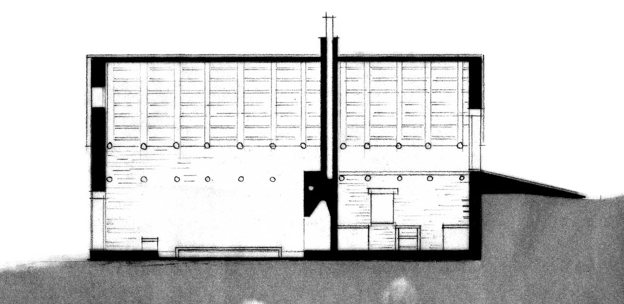 1. Der große ehemalige Stall wird zu einem Gemeinschaftshaus umfunktioniert. Durch sein archaisches Wesen wird essentiellen Handlungen wie Versammeln, Essen, Kochen, Waschen, Körperpflege, etc. ein entsprechender Rahmen verliehen.