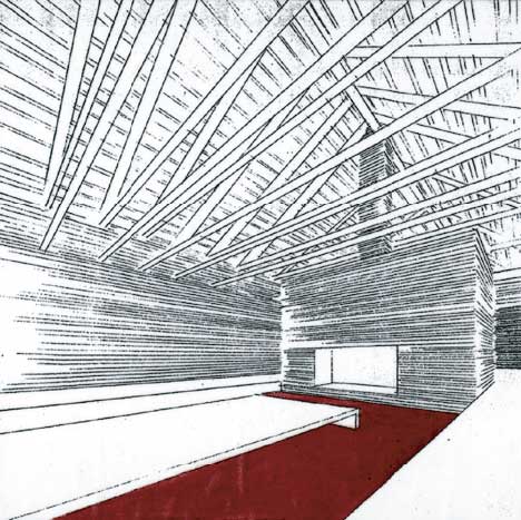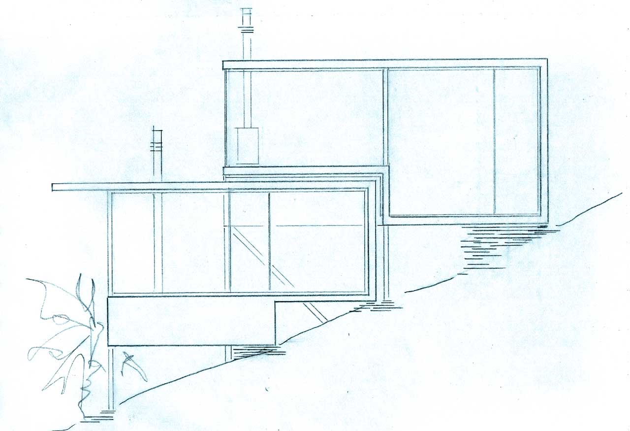 Das Seminarhaus soll Funktionen verschiedenster Seminarbetriebe gerecht werden. Ausgehend davon, dass es um eine Arbeit zu verrrichten, in welcher Form auch immer, einer horizontalen Ebene bedarf, wenn nötig einer Überdachung zum Schutz vor Sonne oder Regen und nicht zuletzt eines mit Wänden halb bis ganz geschlossenen Raumes. Sechs hintereinander gestellte biegesteife Rahmen tragen eine horizontale Lattung. Es entsteht eine zum Tal hin gerichtete 6 x 15 m grosse Freiterrasse. Desweiteren wird ein zweiseitig verglastes 6 x 15 m grosses Raummodul in der Rahmenkonstruktion abgehängt.