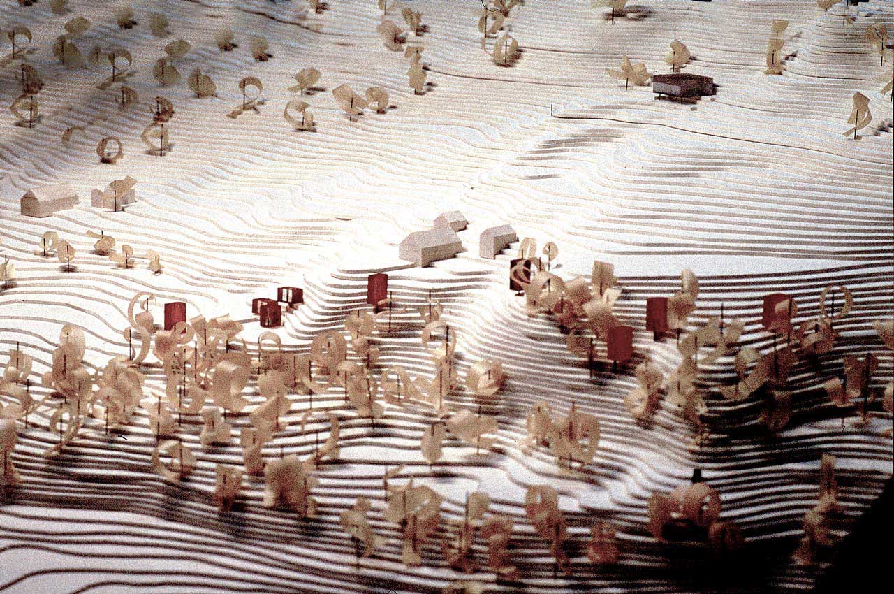 Die neuen Baukörper werden hirarchisch in der Landschaft verteilt. Es gibt eine Mitte, oben und unten.