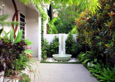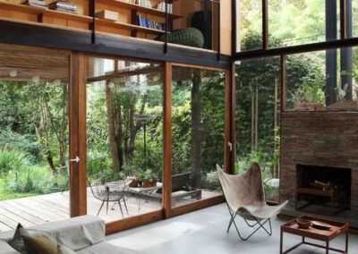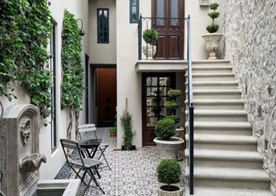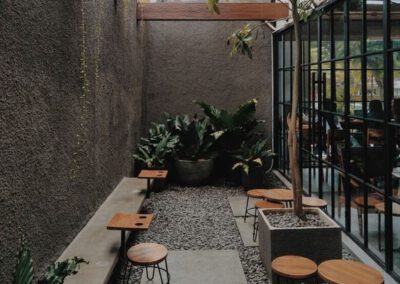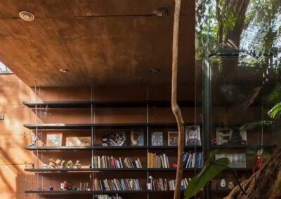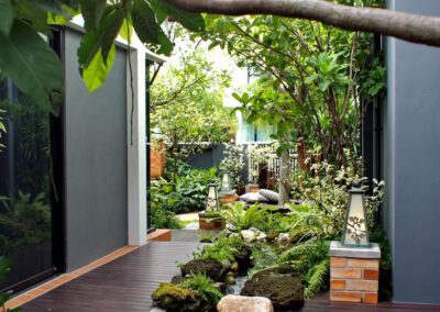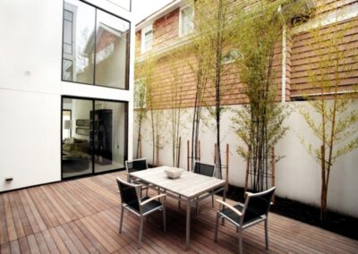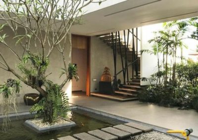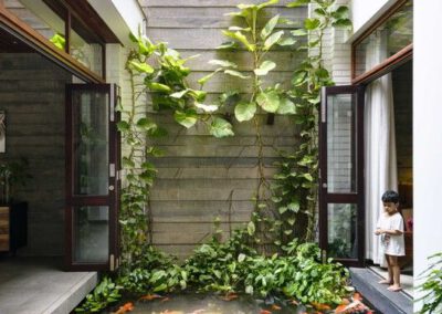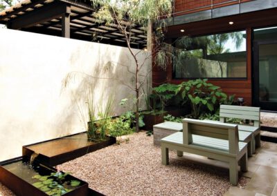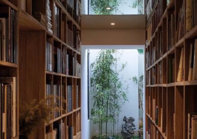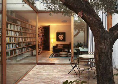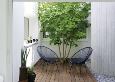 Der Fussboden im Innenraum geht stufenlos in den Hofraum über. Durch einen wenige Zentimeter hohen umlaufenden Versatz entsteht im Boden eine Vertiefung über die das Wasser zur Aussparung in der Bodenplatte läuft und den Baum bewässeert bevor es in die unterirdische Zisterne weitergeleitet wird. Die geschosshohen Holzelemente zwischen den Fenster und Türen schaffen ein stillvolles Ambiente.