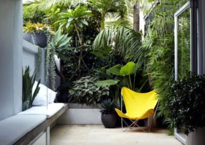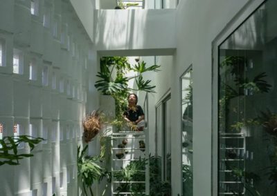 Um das Aufheizen des Gebäudes über die großzügige Verglasung zu vermeiden sind im Obergeschoss raumhohe Jalousien vor den Fenstern und dahinter Vorhänge angeordnet. Das Atelier ist ab mittags durch die teils geschlossenen Wände nach Süden und Westen geschützt. Der Hof ist mit einer offenen Seite nach Süden ausreichend belüftet. Der Baum der nicht nur Schatten spendet, sondern auf Feuchtigkeit abgibt, wird mit freistehenden Pflanzen ergänzt. Das Gründach wird übe die Zisterne automatisiert bewässert und sorgt zudem für kühlere Luft. Ab dem Nachmittag spendet das Atelier im Hof Schatten. Durch den eingearbeiteten Versatz in die Bodenplatte Bodenplatte des Hofes