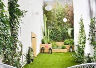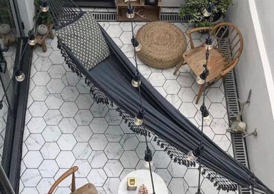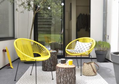Zur Nutzung ist der Hof besonders zum Kochen, Essen und Verweilen geeignet. Bei geöffneten Fenstern und Türen ist es nur ein kleiner Schritt nach draußen. Durch den fließender Übergang zwischen Innen und Außen wird der Wohnraum ein Ganzes. Möbel und Assecoires lassen sich bequem nach draussen bringen und auch mal mehrere Tage stehen lassen. Auch eine dauerhaft installierte Außenküche ist denkbar. Zum Verrichten kleinerer Arbeiten, Sport machen etc. ist der Hof ebenso geeignet.