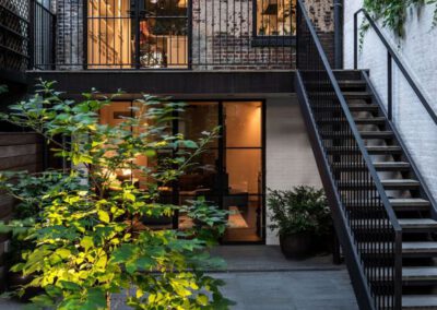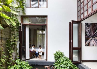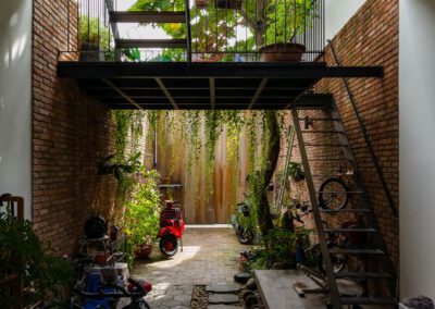 Die Innenräume gehen fließend in den Hof über und können so freier genutzt werden. Es entsteht ein großzügiger und vor allem privater Außenraum inmitten einer dicht bebauten Struktur. Der Hof ist dabei nicht größer als ein großes Wohnzimmer mit Terrasse und max. 2 Stockwerke hoch. Er verbindet alle umliegenden Räume zu einer geschlossenen Einheit. Als erweiterter Wohnraum lädt ein privater Innenhof, ähnlich wie ein Balkon oder angrenzender Garten dazu ein, diesen ebenso zu nutzen und zu gestalten. Für 6 Monate im Jahr kann hier gepflanzt und geerntet werden, gekocht und gegessen, gewohnt und in heißen Sommernächten auch geschlafen werden. Das Klima im Haus ist dabei durch die weit öffenbaren Fenster deutlich angenehmer als in einer Geschosswohnung. Das untere Geschoss ist zurück gesetzt, sodass die angrenzenden Wohnbereiche vor direkter Sonneneinstrahlung und Regen geschützt sind. So können die Türen und Fenster in den Sommermonaten auch bei Regen geöffnet bleiben.